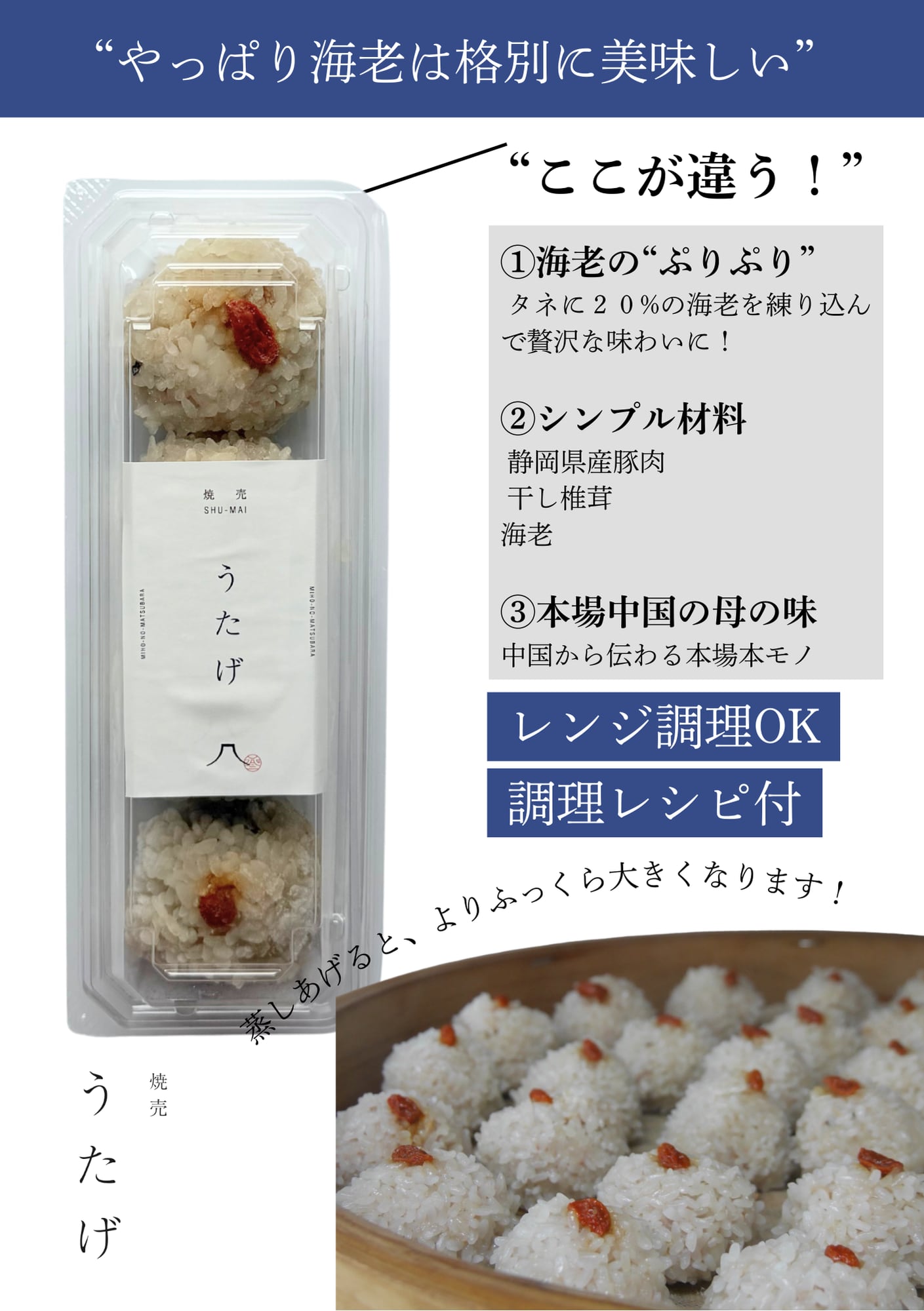 豚肉(静岡県産)、もち米(国産)、海老、干し椎茸、クコの実、砂糖、塩、オイスターソース、片栗粉、卵、中華だし粉末、生姜、胡椒、こんにゃく粉/調味料(アミノ酸)、(一部に卵、乳成分、大豆、鶏肉、豚肉、牛肉を含む)